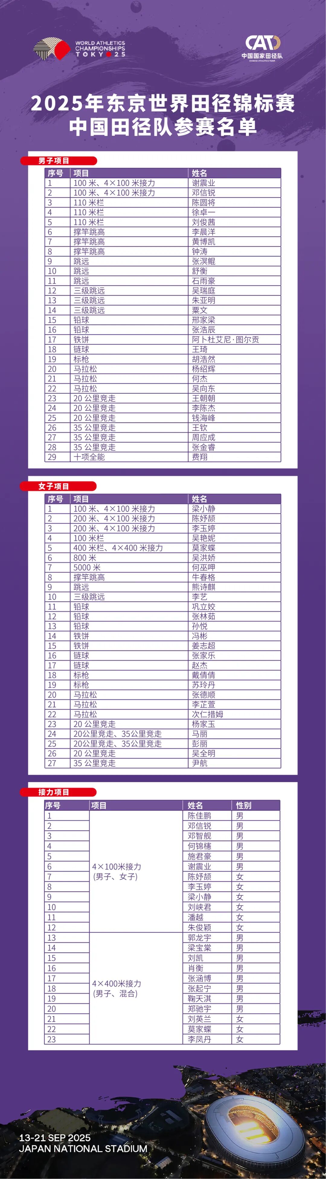 当游泳、羽毛球等项目的顶尖盛会相继上演之后,田径世界即将在9月迎来巅峰时刻。9月13日至21日,2025年世界田径锦标赛将在日本东京举行。北京时间9月6日中午,中国田径队正式公布了参加本届世锦赛的运动员名单,73人(男运动员41名,女运动员32名)的参赛阵容将参加全部49个项目中33个项目的争夺,巩立姣、杨家玉、冯彬等奥运会、世锦赛冠军悉数在列。