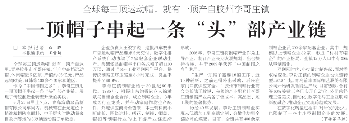 ◎全球每三顶运动帽,就有一顶产自胶州李哥庄镇