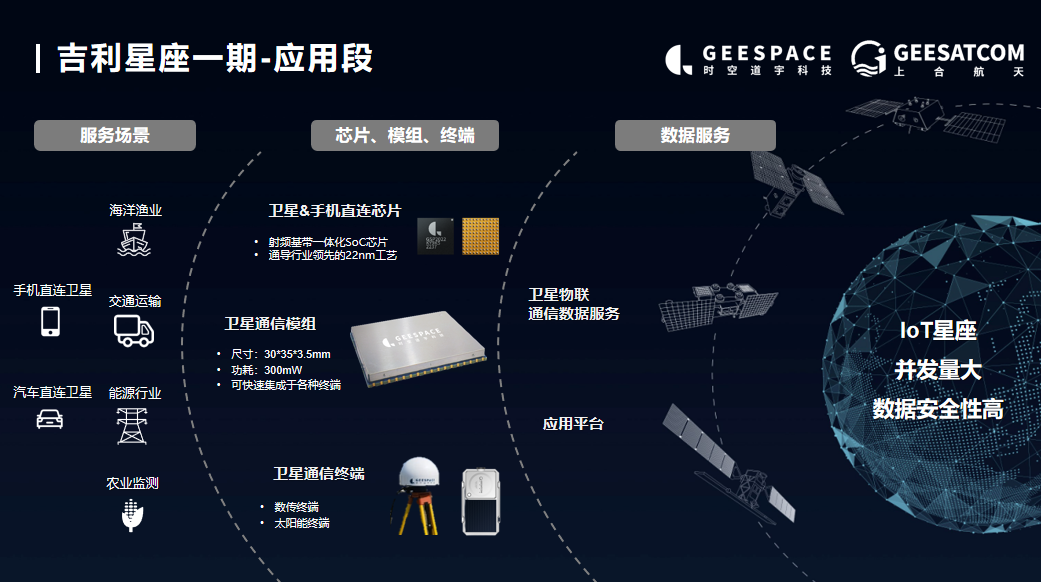 在吉利星座运营方面,我们聚焦智能网联汽车、海洋渔业、工程机械、低空出行、应急通信、交通物流、公共设施、能源、水利、农林及畜牧业等行业用户需求,提供高可靠、多元化、高性价比的卫星数据通信服务及整体解决方案。