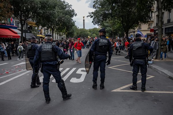 9月10日,警察在法国巴黎夏特莱广场附近的游行示威现场警戒。(新华社)