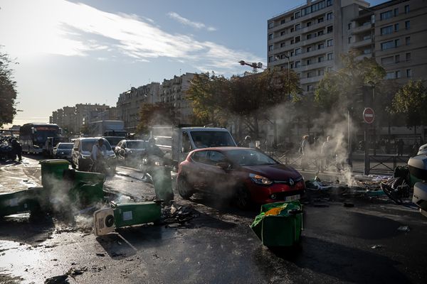 9月10日,在法国巴黎街头,示威者用垃圾桶封锁道路。(新华社)