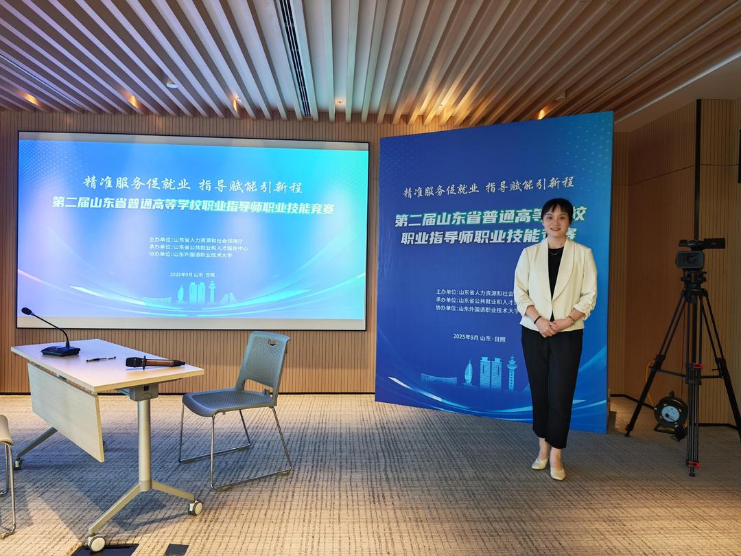 本次竞赛分为学校初赛、山东省网络评审和现场竞技三个环节,重点考察职业指导教师的理论素养、实践能力与综合服务水平。在现场竞技中,苏畅老师先后完成主题演讲、情景模拟和专家提问三个环节,充分展现了我校职业指导教师的专业风采和应变能力。