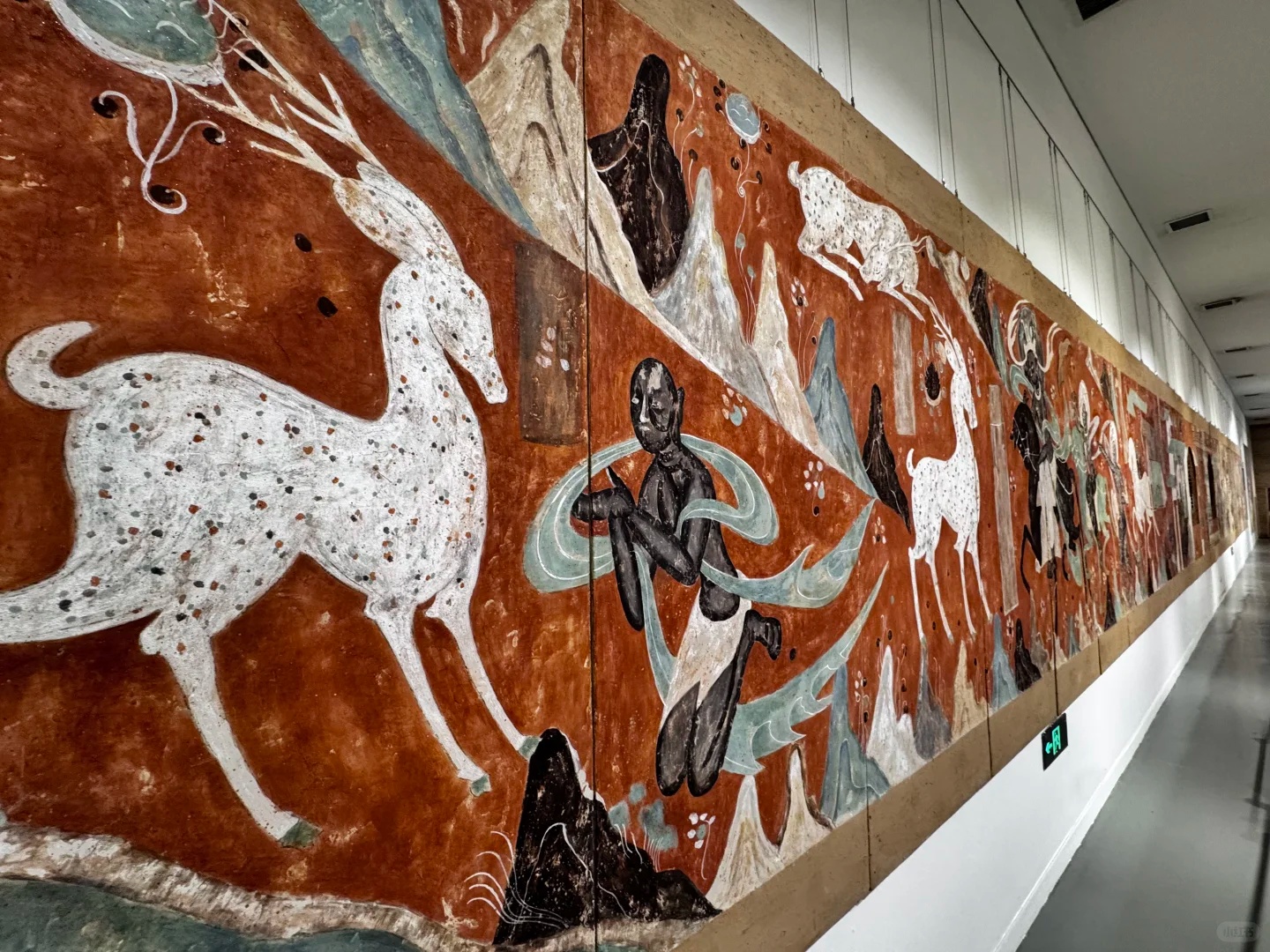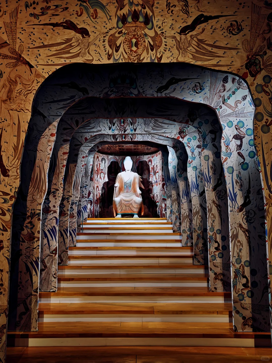 “流动的敦煌——技艺圣火凝固敦煌绝色”单元,通过世界非遗珂罗版技艺,精准复刻了敦煌特窟壁画。这些珍品出自传承人李东方之手,凝结了她30多年的匠心。你可以近距离欣赏长达26米的《鹿王本生图》、3窟《千手千眼观世音菩萨》(元代密教艺术巅峰之作)、57窟《美人菩萨》以及20窟《维摩诘像》等文物级壁画复刻。这些画作不仅再现了古老壁画原本的形、色、肌质和强烈的色彩表现力,更传递出人与自然万物和谐相处的精神,让你仿佛走进古人的精神家园,解读“万物共生”的古老启示。