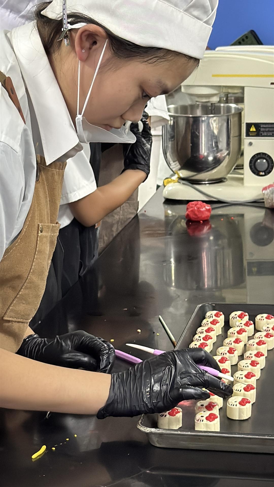在淄博市技师学院现代餐旅实训中心,哈尼家的老师正在指导学生制作创意月饼。据介绍,学院实训中心建设投资2000万元、建筑面积1800平方米,是集餐旅教学、技能培训、大赛集训、人才评价等功能于一体的“江北一流”餐旅综合实训中心。与会人员先后观摩了“一点心意”学生创新创业基地、中式面点实训室、西式面点实训室、多媒体数字化教学演示教室、国家级烘焙大师工作室等,边看边谈边交流,各烘焙机构对实训中心的设备场地、教学成效、“工学商”一体化模式等高度认可,校校之间、校企之间合作意向进一步加强。