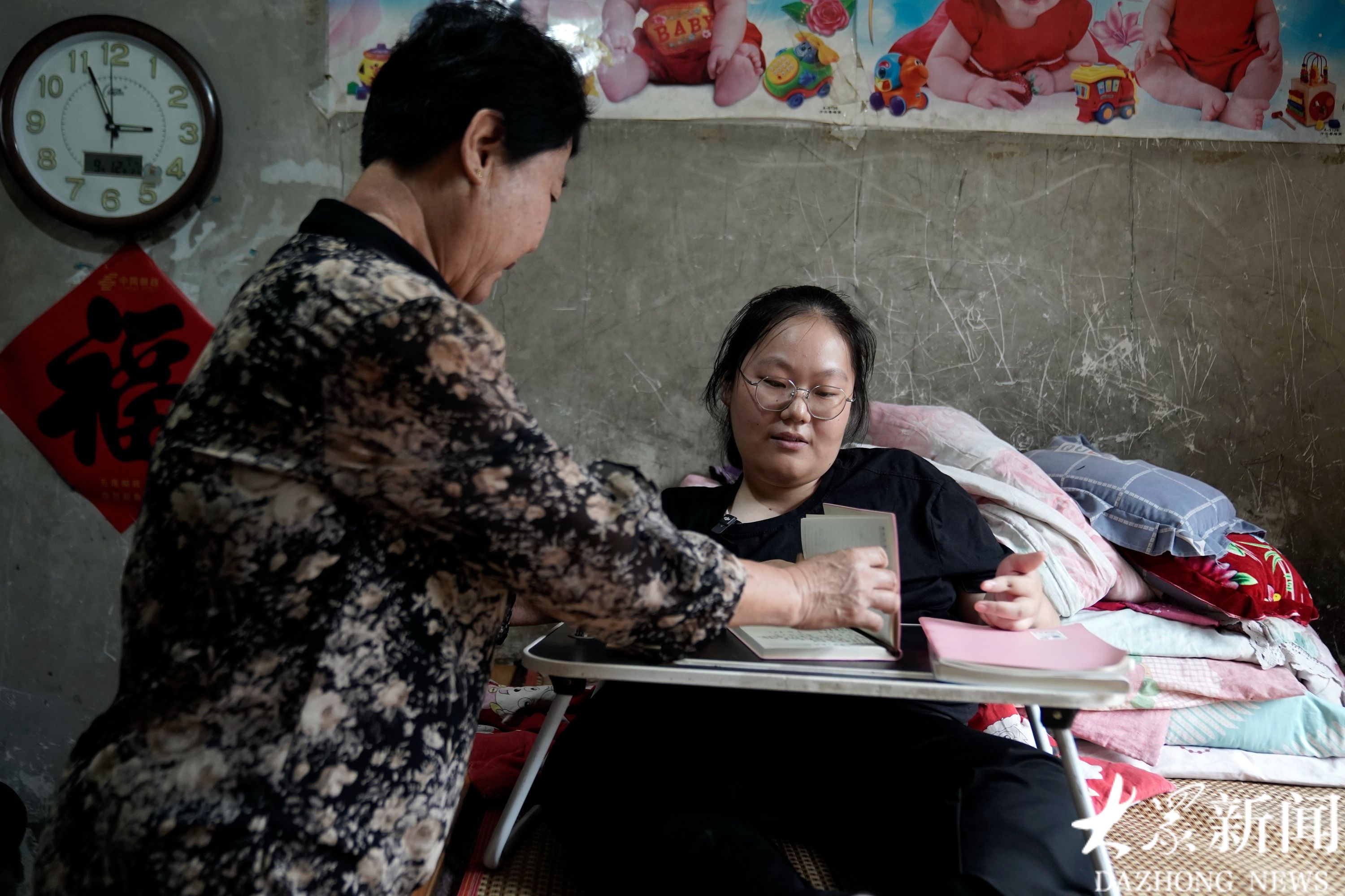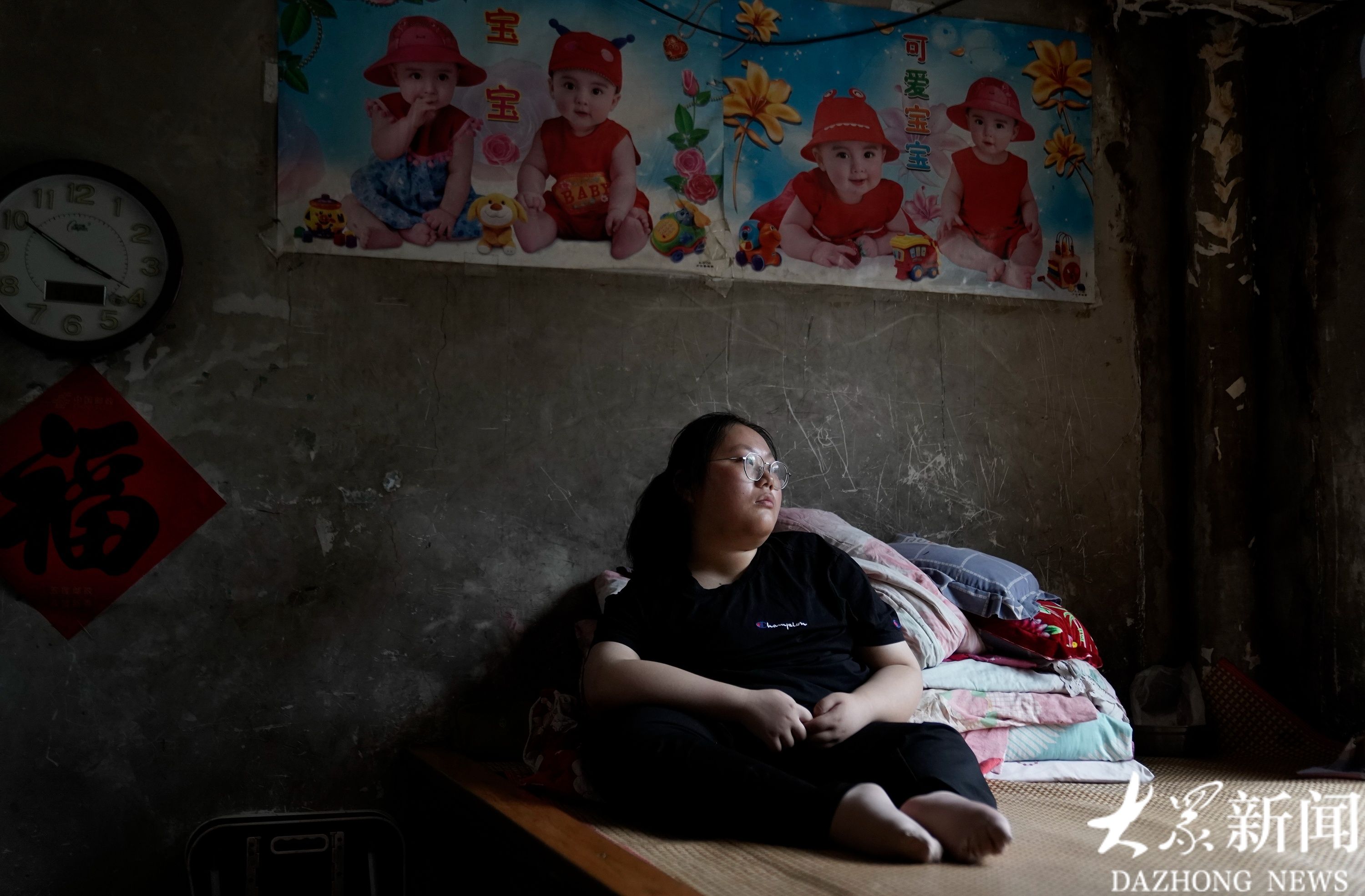 9月12日,山东省日照市五莲县高泽村,何炎格坐在床上,床头上方的墙上贴满了可爱宝宝的年画