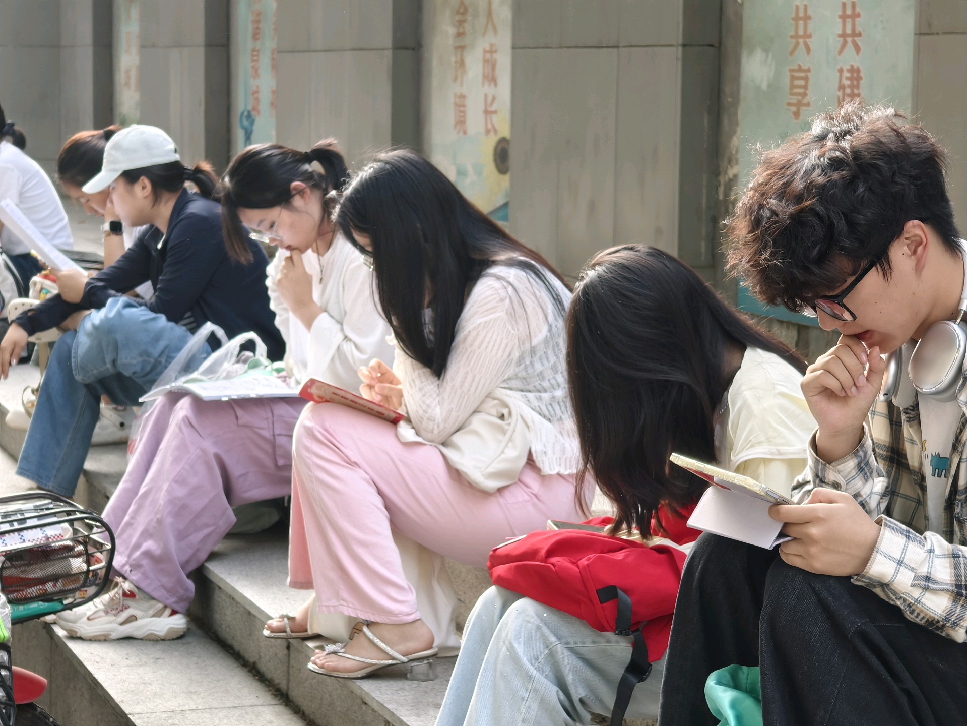 上午7时42分,在山东传媒职业学院文东校区考点门口,考生们蹲坐在台阶上,或低头专注看资料,或轻声默念知识点。(记者屈庆春 摄)