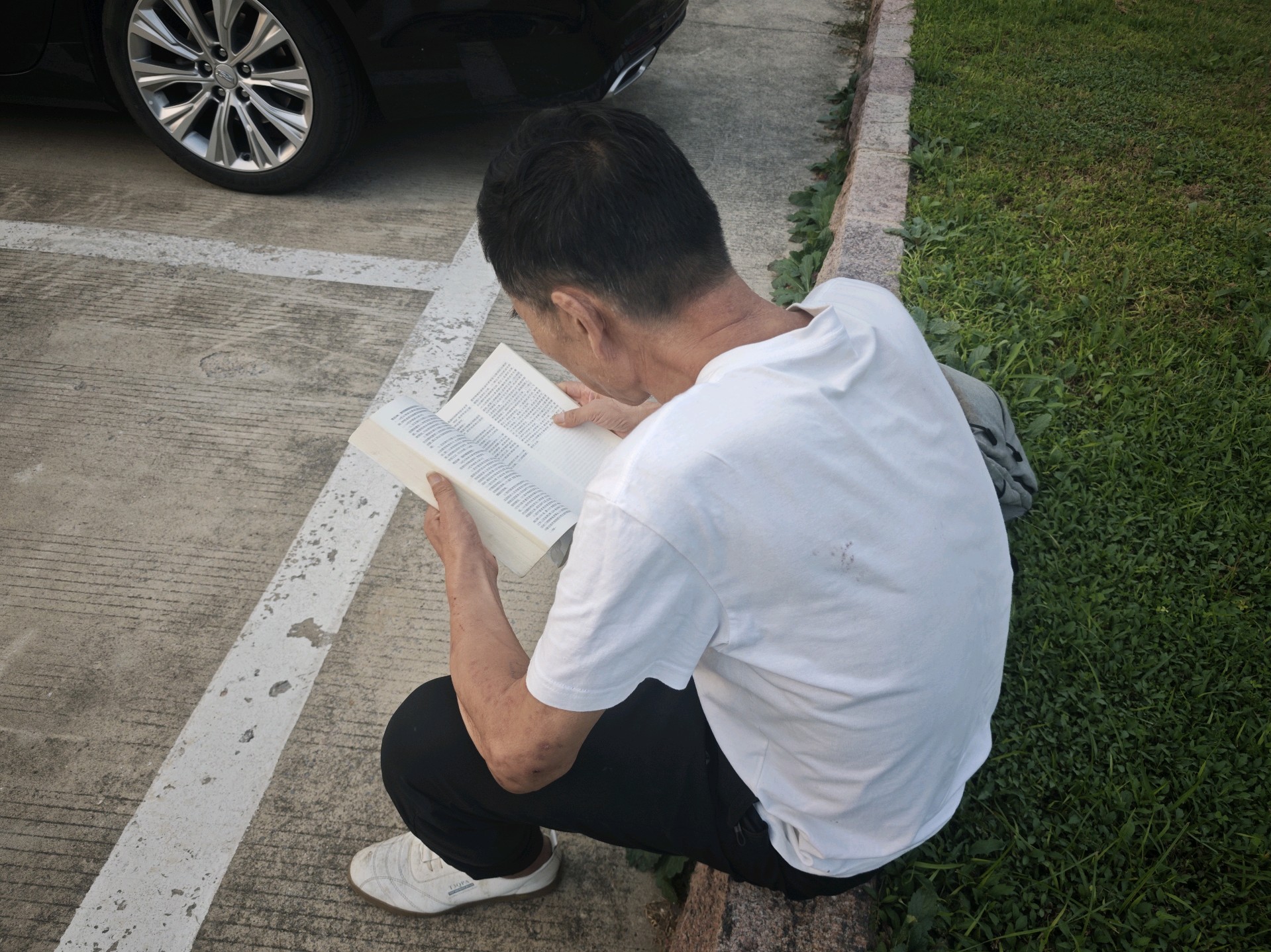 下午17时55分,在山东财经大学舜耕校区考点门口,62岁的退休考生张先生走出考场后,拿出备考书本查找知识点。前一天刚出院的他,今天走出考场感到十分满足。25年前他因2分之差与法律行业无缘,多年来法考成了他的未竟之志,如今步入退休生活,他决定再战法考,给“年轻的自己”一个交代。(记者陈瑞阳 摄)