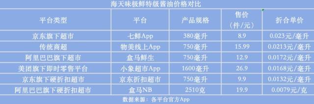快消品同样有低价优势。以海天味极鲜特级酱油为例,七鲜的380毫升装售价为8.9元;小象超市的1.6升装为26.9元;盒马鲜生和物美750毫升装的价格分别为12.9元、15.99元。而京东折扣超市线上平台的海天味极鲜特级酱油750毫升仅售9.9元、盒马NB推出2.51千克大桶装售价仅19.9元,价格明显低于其他超市。