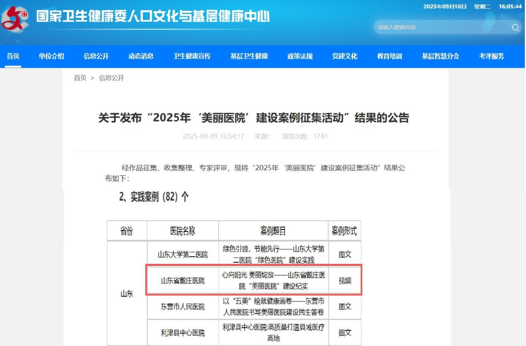 9月9日,国家卫生健康委人口文化与基层健康中心公布了《“2025年‘美丽医院’建设案例征集活动”》结果,经作品征集、收集整理、专家评审,共评选出创新案例和实践案例各82个。戴庄医院申报的视频案例《心向阳光 美丽绽放——山东省戴庄医院“美丽医院”建设纪实》获评全国实践案例,全省仅4家、全市仅1家医院获此殊荣,这也是医院再次成功斩获此项国家级荣誉。