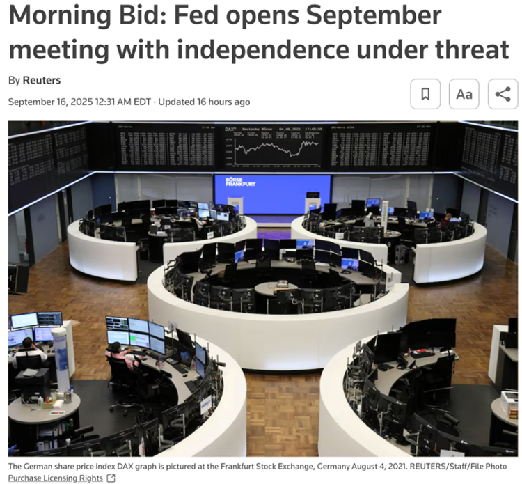 路透社报道,9月的美联储政策审议会议,是在其独立性受到威胁的情况下召开的(来源:央视新闻)