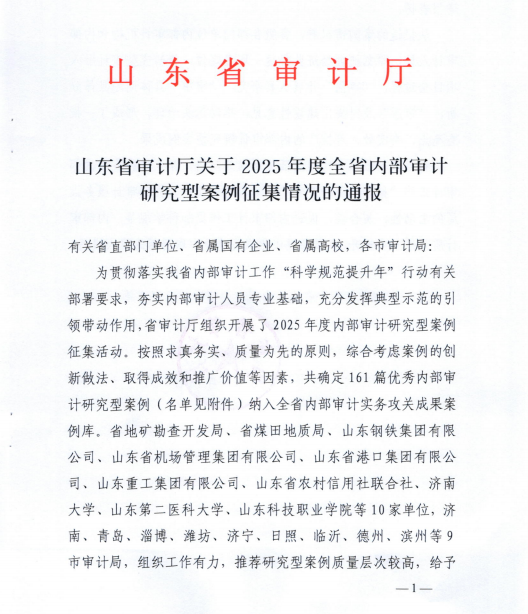 近日,山东省审计厅下发《关于2025年度全省内部审计研究型案例征集情况的通报》,学校报送的《以研究型审计为抓手,用心用力用情解决师生急难愁盼》审计案例,获评2025年度全省优秀内部审计研究型案例,纳入全省内部审计实务攻关成果案例库。