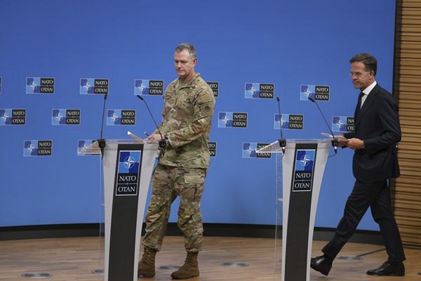 9月12日,北约秘书长吕特(右)和北约欧洲盟军最高司令格林克维奇在北约总部出席新闻发布会。新华社