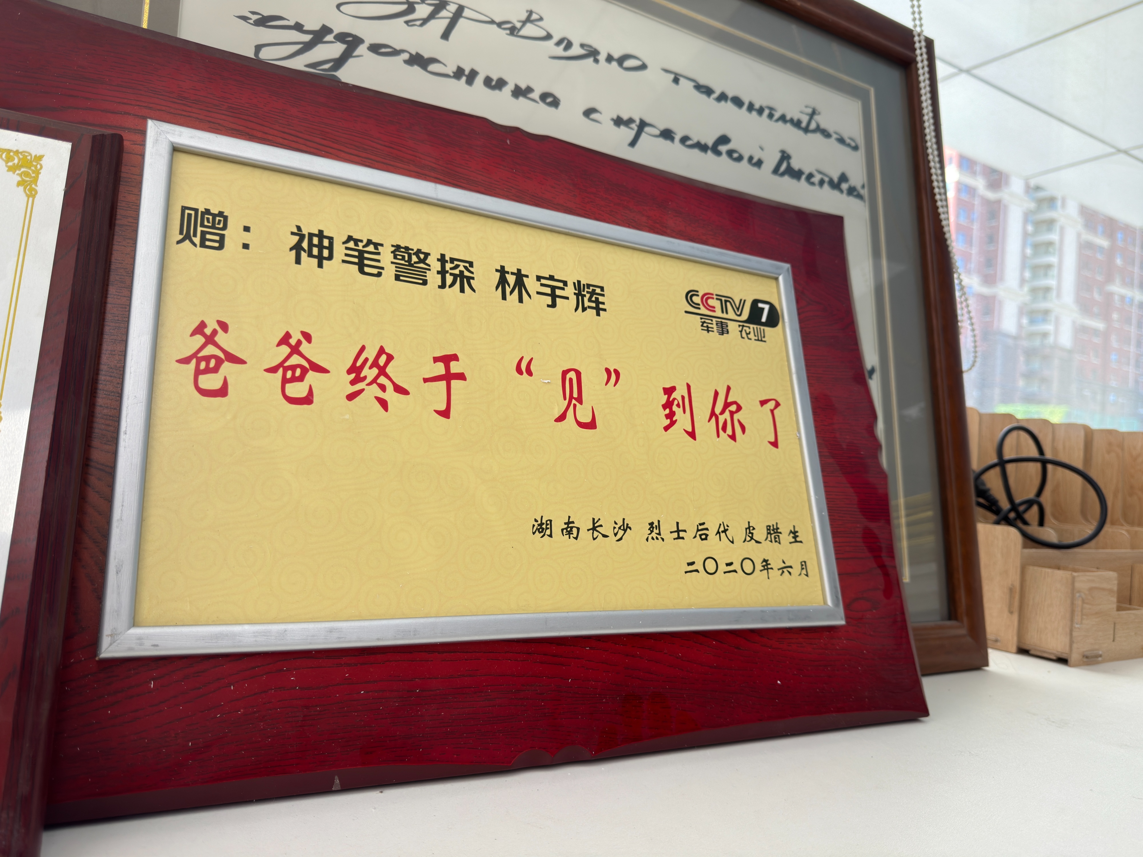 工作室的墙上挂着数百位烈士和走失儿童的画像,展柜里数百支用到没墨的笔,述说着这位老警察的专业和温情。“申聪的案子我记得比较清楚。”林宇辉回忆道。当时,寻子多年的申军良拿着一岁半孩子的照片,请求画出孩子15岁的模样。这个任务难度极高——幼儿到青少年的面部骨骼变化巨大。林宇辉仔细分析父母特征,前后绘制了两次走失孩子15岁的模拟像。