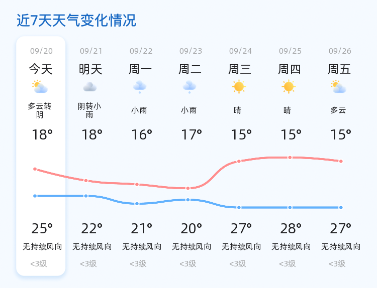 明天的天气情况与今天相比有所变化,预计阴转小雨,气温较今天有所下降,最高气温22℃,最低气温18℃。风力依旧较小,以无持续风向为主,市民出行需注意携带雨具,防范降雨带来的不便。