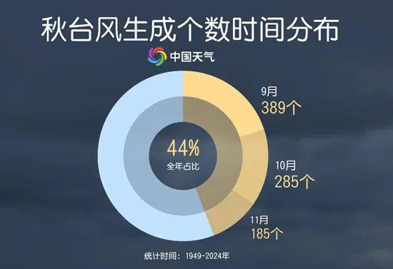 通常,我们把6月至8月生成的台风称为夏台风,9月至11月生成的台风称为秋台风。中国天气网统计显示,1949年至2024年间,夏季生成台风个数为867个,为台风最活跃季节,而秋季也有859个台风生成,全年占比44%,仅次于夏季。