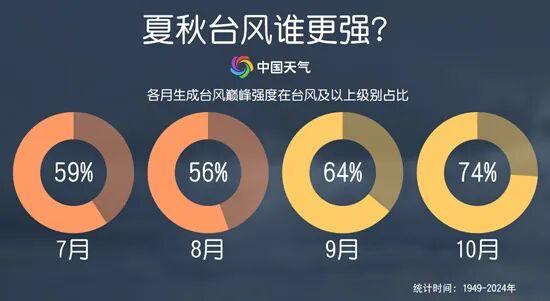 虽然夏季台风的生成数量是一年中最多的,但从各台风的巅峰强度来看,秋台风的实力更胜一筹。1949年至2024年数据显示,七月和八月的台风,巅峰强度在台风及以上级别占比不足60%(在当月台风总数中的占比),而九月和十月台风的巅峰强度达到台风及以上级别的占比都超过60%,其中十月高达74%。