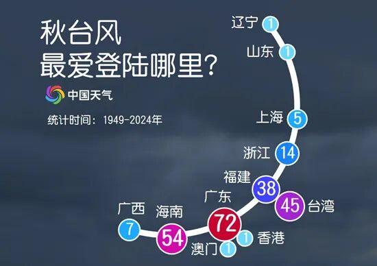 与夏台风相比,登陆我国的秋台风登陆地点明显偏南。气象大数据显示,夏台风多在广东、福建、台湾、浙江等地登陆,在辽宁、山东、江苏等偏北地区登陆的也比较常见;而秋台风路径相对偏南,秋台风登陆最多的为广东、海南、台湾和福建,其中广东高达72次,除2022年的台风“梅花”一路北上登陆了山东、辽宁外,再无秋台风登陆江苏以北的情况。