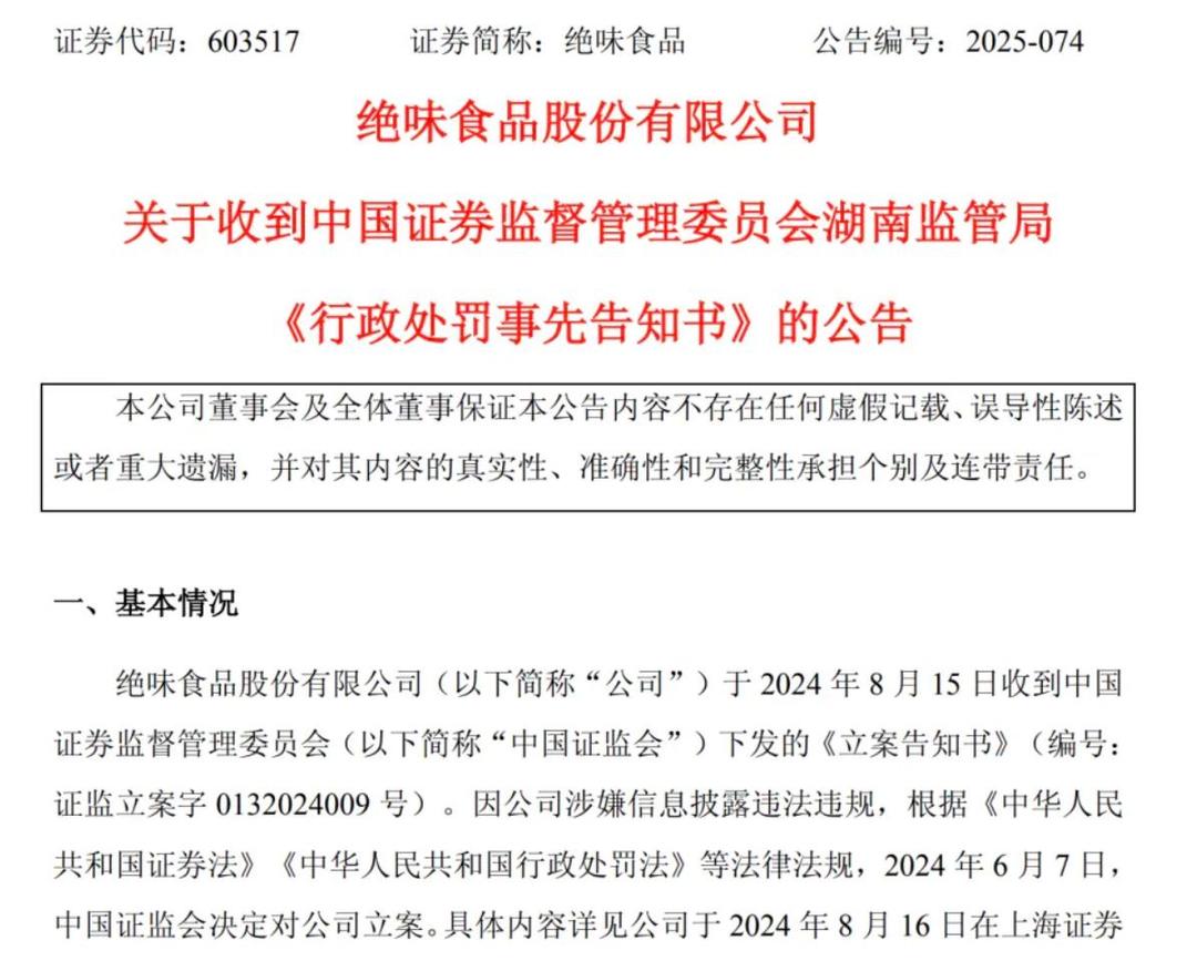 9月19日晚间,绝味食品发布公告称,公司于2024年8月15日收到中国证监会下发的《立案告知书》,因公司涉嫌信息披露违法违规,2024年6月7日中国证监会决定对公司立案。公司于2025年9月19日收到中国证监会湖南监管局下发的《行政处罚事先告知书》(以下简称“《事先告知书》”)。《事先告知书》指出,绝味食品涉嫌信息披露违法违规。