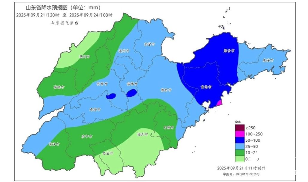 受台风“桦加沙”远距离水汽输送和高空槽共同影响,预计21日夜间至23日夜间,我省以阴雨天气为主,全省累积平均降水量20~40毫米。21日夜间至22日白天,全省大部地区有小雨局部中雨,累积平均降水量2~5毫米。22日夜间至23日夜间,青岛、烟台和威海有大雨到暴雨局部大暴雨(30~50毫米局部100毫米以上),滨州、东营、济南、泰安、淄博和潍坊有中到大雨局部暴雨(20~40毫米局部50~80毫米),其他地区有小到中雨局部大雨(5~15毫米局部25毫米以上),最大小时降水量30~50毫米,累积平均降水量20~30毫米。