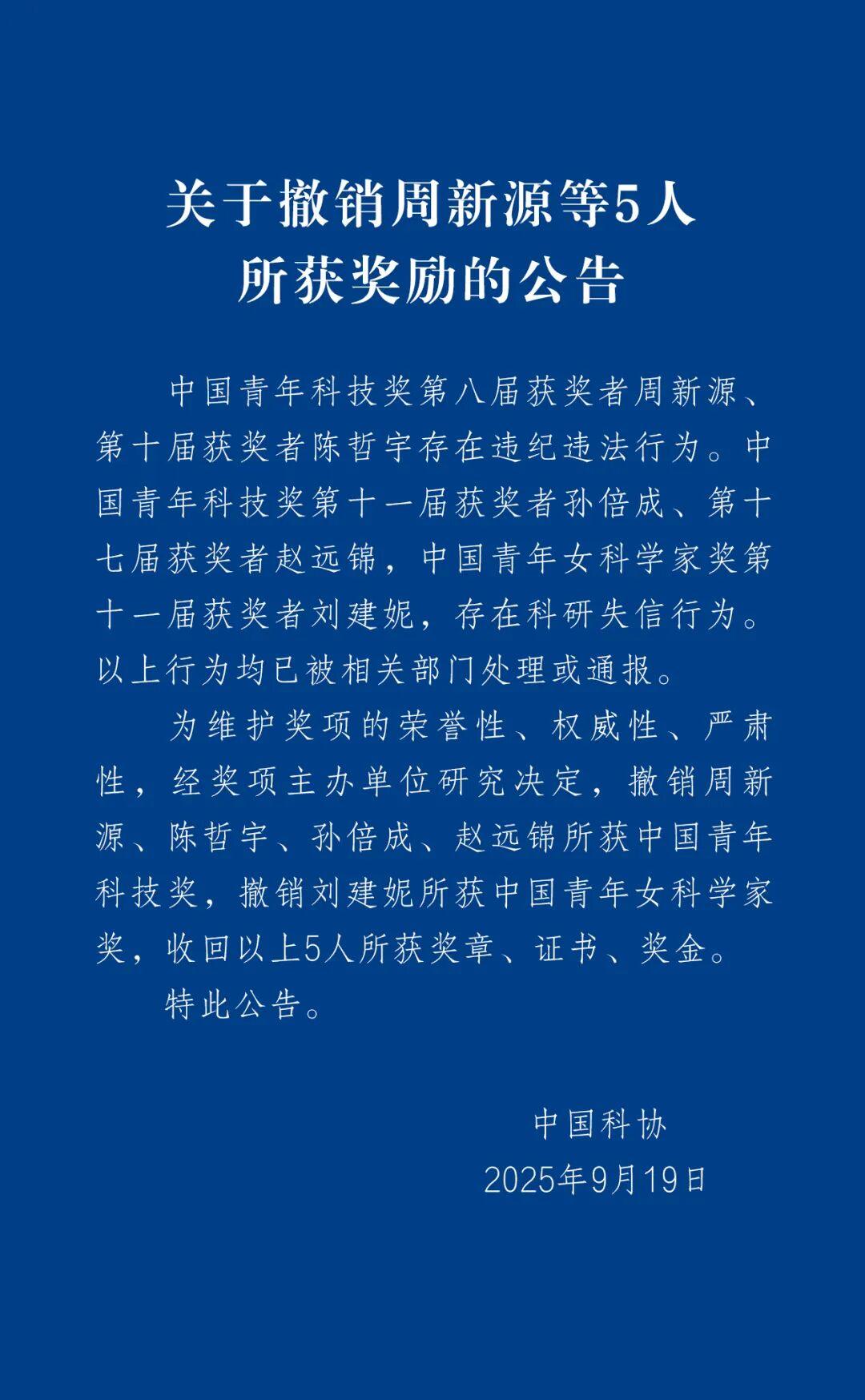 为维护奖项的荣誉性、权威性、严肃性,经奖项主办单位研究决定,撤销周新源、陈哲宇、孙倍成、赵远锦所获中国青年科技奖,撤销刘建妮所获中国青年女科学家奖,收回以上5人所获奖章、证书、奖金。