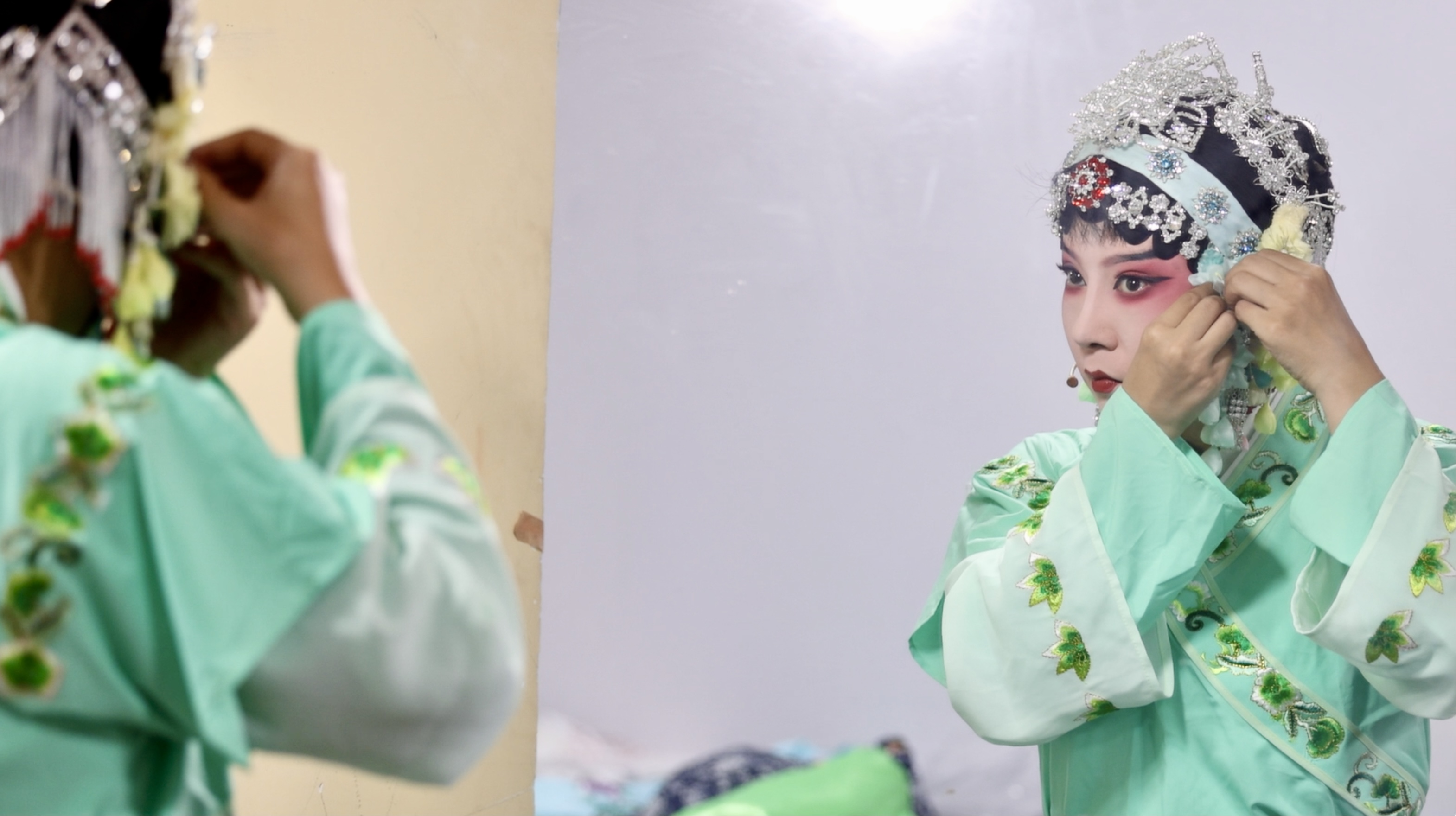 12:30,后台。曹县剧团演员郑玲玲一边对镜理妆,一边低声吟哦,“今天是新排大戏豫剧《义烈女》首演,可得铆足劲。”
