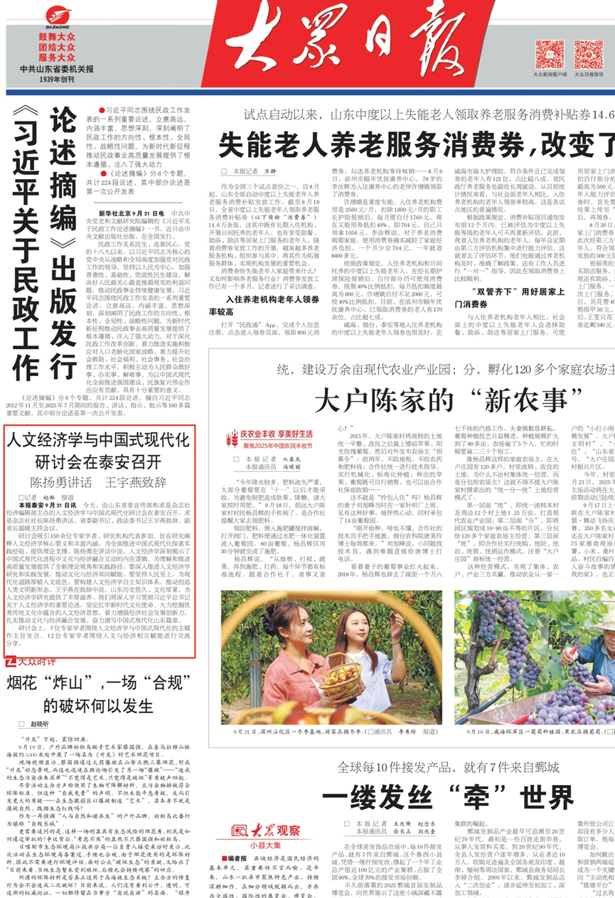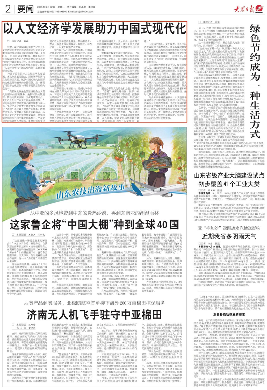 9月22日,头版、要闻分别刊发《人文经济学与中国式现代化研讨会在泰安召开》《以人文经济学发展助力中国式现代化》,报道由山东省委宣传部、求是杂志社经济编辑部主办的人文经济学与中国式现代化研讨会在泰安召开。来自全国各地的150多位专家学者和各界代表参会,聚焦“人文经济学与中国式现代化”主题开展研讨交流。详情请点击这里——