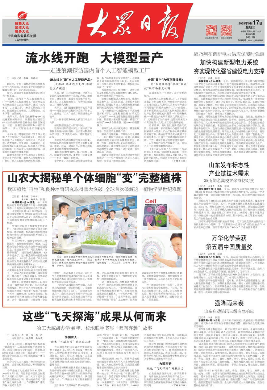 9月17日,头版刊发《山农大揭秘单个体细胞“变”完整植株》,报道全球顶级学术期刊《细胞》在线发表山东农业大学研究团队论文,首次揭示了单个体细胞发育成完整植株背后的分子机制,标志着中国在植物发育和生物技术研究领域为世界作出了里程碑式的贡献。详情请点击这里——