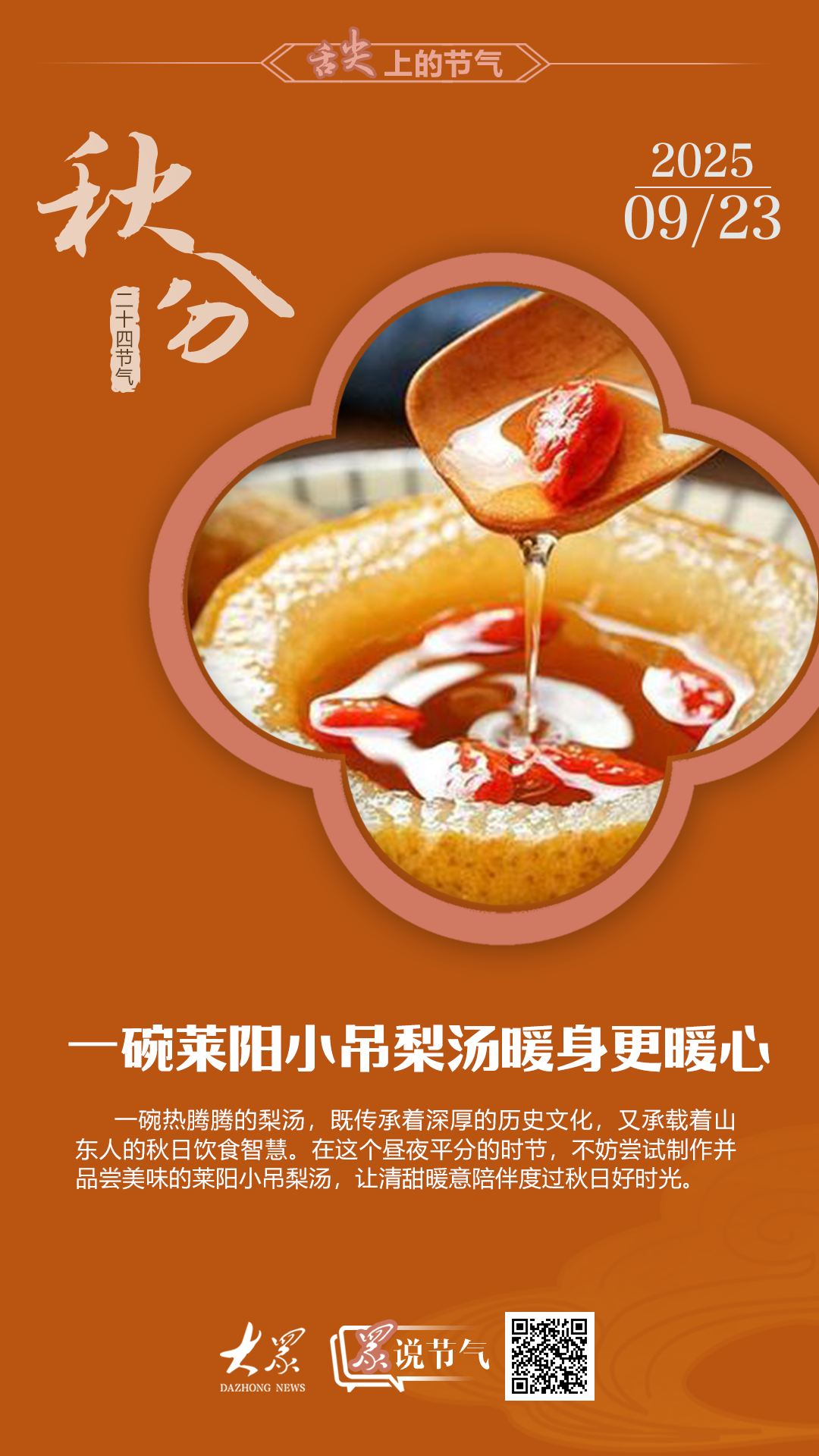 秋分宣告着秋季正式步入中期。此时,山东大地气温渐降,空气愈发干燥,人们的饮食也随之改变,一款温润滋养的传统饮品——莱阳小吊梨汤,开始频繁出现在山东人的餐桌上。