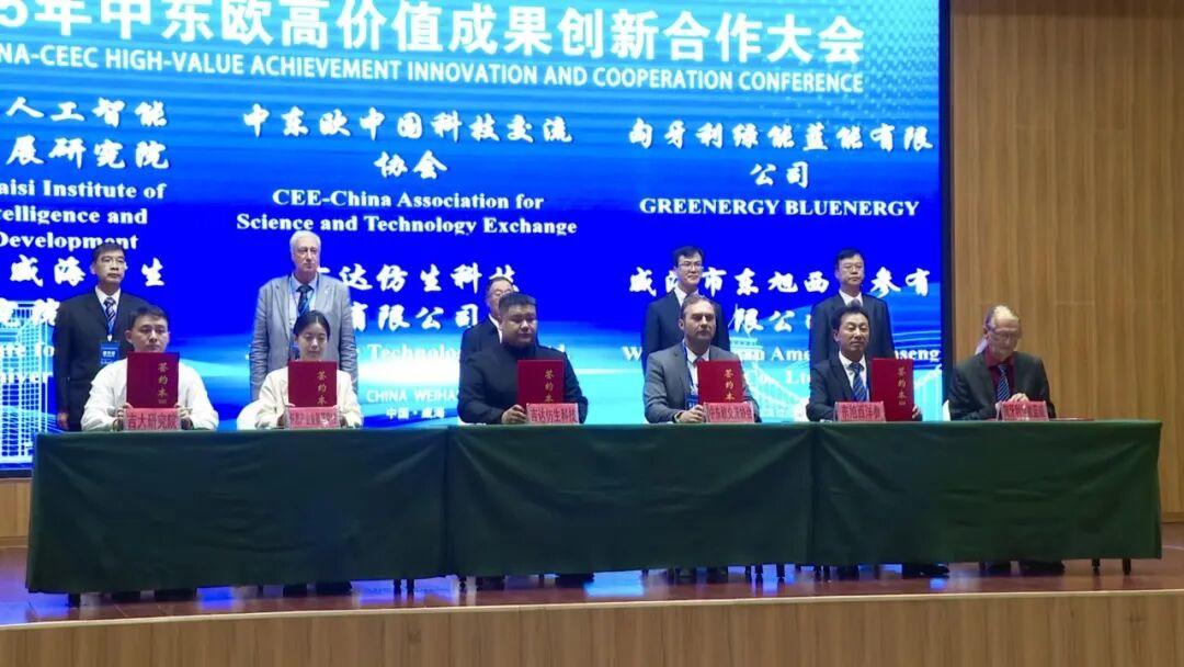 中东欧国家在汽车制造、精密机械、电子信息、生物医药、农业食品加工等领域拥有深厚的产业基础与独特优势。这些领域与吉林大学威海仿生研究院聚焦的仿生机械、仿生材料、仿生智能及仿生健康等研究方向高度契合,为双方合作提供了广阔空间。会上,中东欧中国科技交流协会与吉林大学威海仿生研究院共同揭牌成立了“中东欧科技创新成果数据中心”。“通过搭建这个平台,整合各类资源,为有意愿出海的企业和有需要外国专家参与的项目提供帮助。”中东欧中国科技交流协会会长、山东省海智计划特聘专家矫超表示。作为促进中东欧产学研深度合作的重要平台,此次大会也促成了多家外企与威海企业达成合作。“匈牙利的一家企业的产品对于荒漠化有改良效果,我们通过它的产品和我们当地的土质结合,进行产品提升,然后在国内进行推广。”山东栋森洲际生物工程有限公司总经理朱乐说。
