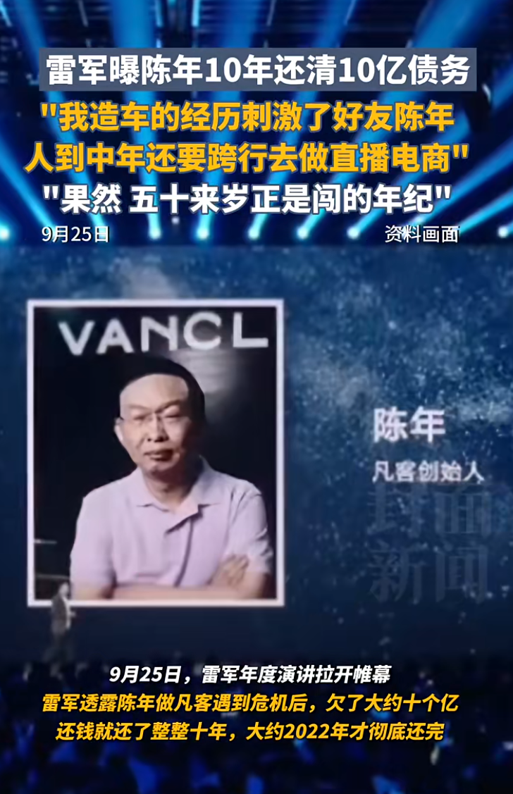 9月25日,雷军年度演讲拉开帷幕,在演讲会上雷军透露陈年做凡客遇到危机后,欠了大约十个亿,还钱就还了整整十年,大约2022年才彻底还完。随后,相关话题冲上热搜。