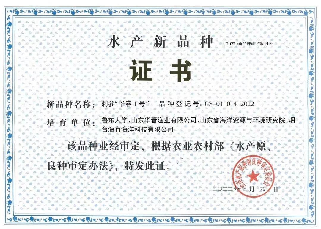 刺参“华春1号”是鲁东大学遗传育种团队联合山东华春渔业有限公司等四家单位共同进行选育,自2007年始收集四个野生刺参群体为原种,繁育后的群体做为育种基础群体,以夏季高温耐受力辅以生长速度为选育目标,利用群体继代选育技术,经连续4代选育而成。在相同养殖条件下,与未经选育的刺参相比,12月龄32℃下养殖7天成活率提高33.3%;19月龄成活率提高49.5%,体重提高29.0%。适宜在我国刺参主养区水温2~31℃和盐度24~34的水体中养殖。2022年,刺参“华春1号”通过国家原良种委员会水产新品种审定。2025年,刺参“华春1号”被确定为山东省农业主导品种。