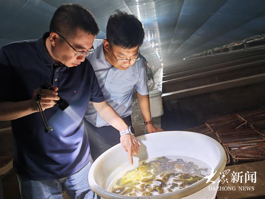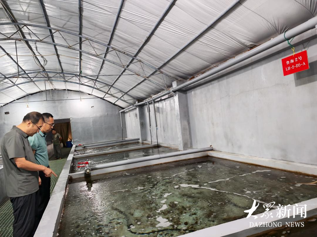 山东省刺参产业技术体系首席专家胡炜(左)到好当家刺参繁育良种车间调研服务。