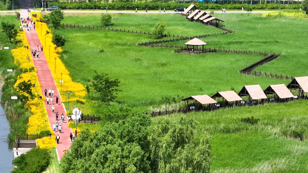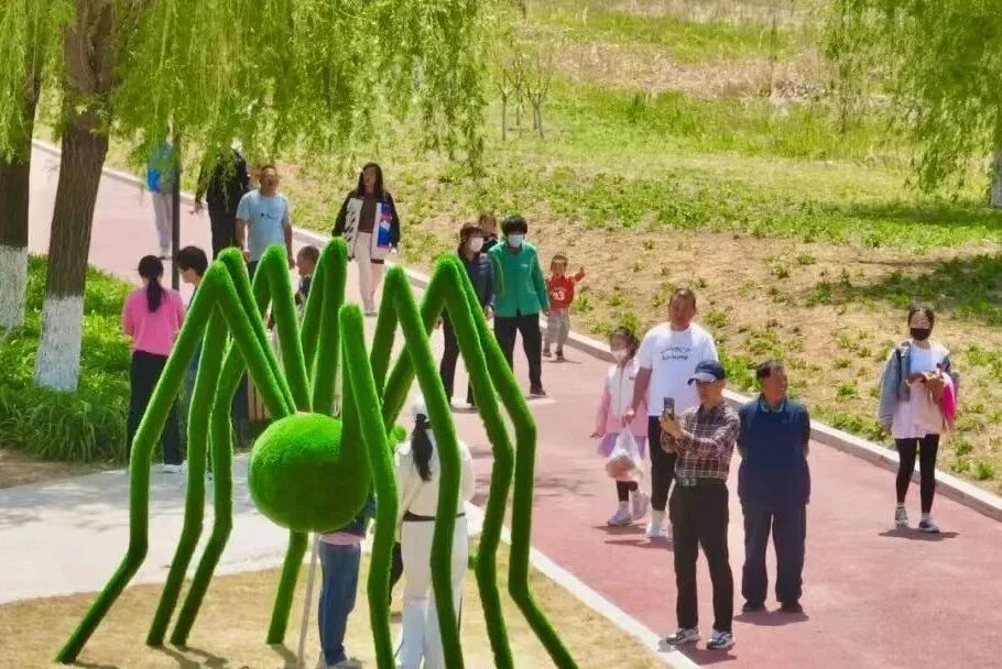 在金花河湿地公园,芦苇荡随风轻摇,黑天鹅优雅游弋,大雁不时掠过水面,空气里满是草木与水汽的清香。沿甬道漫步,还能偶遇俏皮网红雕塑,随手合影,收藏清新与治愈。