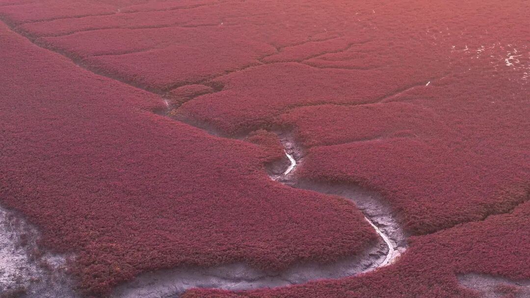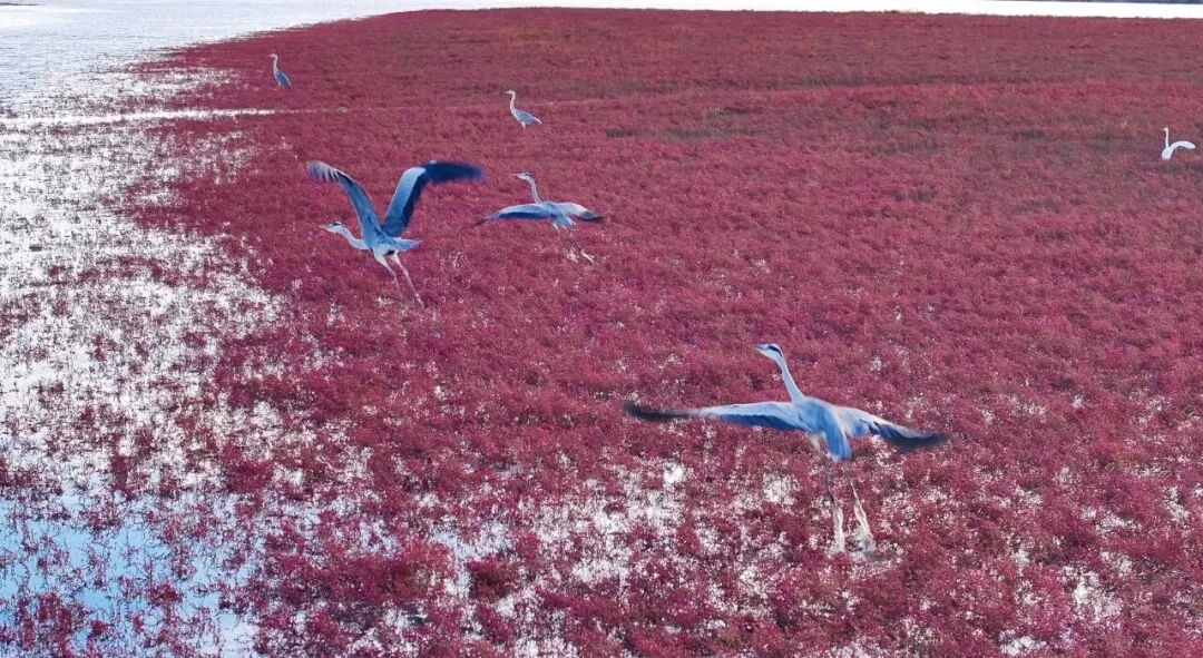 秋日里的红海滩如无边红毯般铺展在滩涂上,红滩、飞鸟与辽阔滩涂相映成趣,构成一幅灵动的天然生态画卷,随手按下快门,每一张都是满溢自然之美的大片。