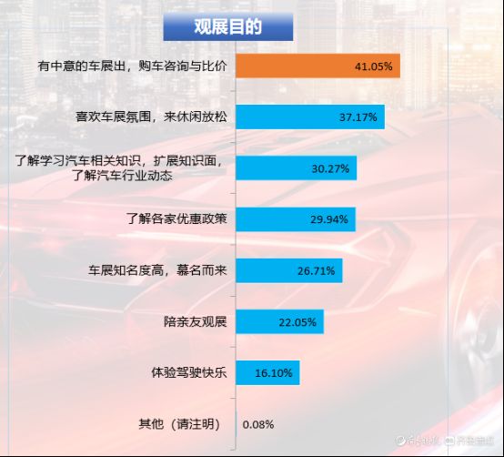 《报告》显示,受访者前来车展是以购车为主,“为车而来”目的体现较为明显,“有中意的车展出,购车咨询与比价”占比达到41.05%;车展提供试驾服务,让参观者有机会亲身体验心仪车型的性能、操控和舒适度等,“体验驾驶快乐”成为观展目的之一。