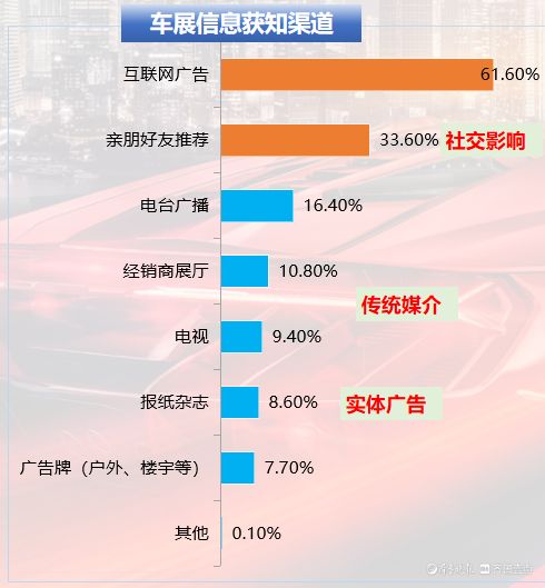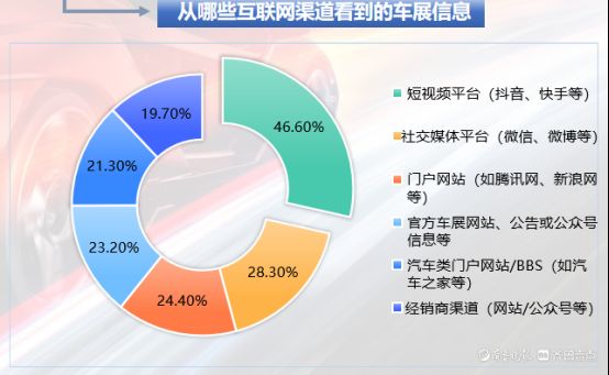 互联网渠道中,短视频平台(抖音、快手等)、社交媒体平台(微信、微博等)和门户网站成为更多人获取汽车/车展信息的三大主要渠道,之后为官方车展网站、公告或公众号信息,汽车类门户网站/BBS,经销商渠道(网站/公众号等)等。