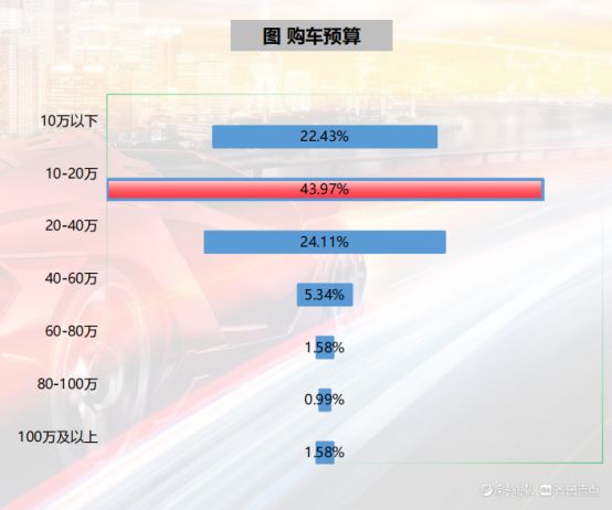 《报告》显示,购车预算方面,40万元以内预算为主流需求,占比90.51%;有43.97%的受访观众预算区间为10-20万元,24.11%的受访者购车预算在20万-40万之间,另有22.43的受访者购车预算在10万元以内。