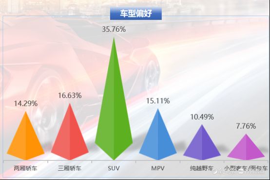 在购车车型偏好方面,超三分之一的受访者偏好SUV车型,SUV车型持续领跑家庭消费,家庭用户与商务精英的“全能座驾”,以空间灵活等适配家庭出行与户外探索。在任一价位区间,SUV均是购车首选,更受到女性群体的偏爱。