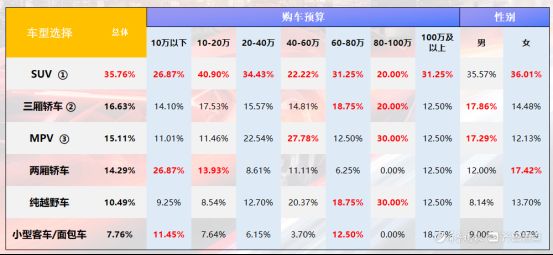 40万元以上预算,男性群体对于三箱轿车、MPV购买欲较强。三厢轿车作为“家庭/商务标杆”,在年轻群体与商务场景中保持稳定需求;MPV凭借高端化、电动化趋势在商务与家庭出行领域快速崛起。