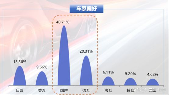 随着国产品牌的进步,近年来国产车日益受到消费者青睐。《报告》显示,国产车成为受访者购车首选,40.7%的受访者表示偏好国产车,比亚迪、长安、哈弗等国产品牌备受青睐;此前备受国内消费者认可的德系车与日系车,仍有众多消费者喜爱,20.3%的受访者偏好德系车,大众、奥迪、宝马热度不减,13.4%的受访者偏好日系车,首选丰田、本田。