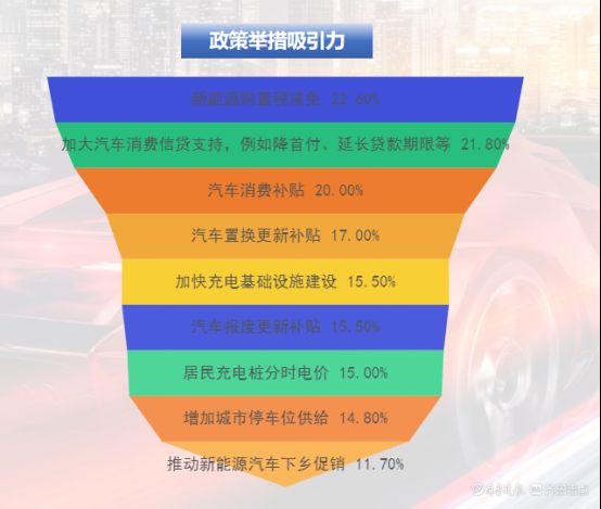 另外,汽车置换更新补贴、加快充电基础设施建设、居民充电桩分时电价、增加城市停车位、推动新能源汽车下乡促销等政策措施,吸引超过10%的受访者产生购车兴趣。