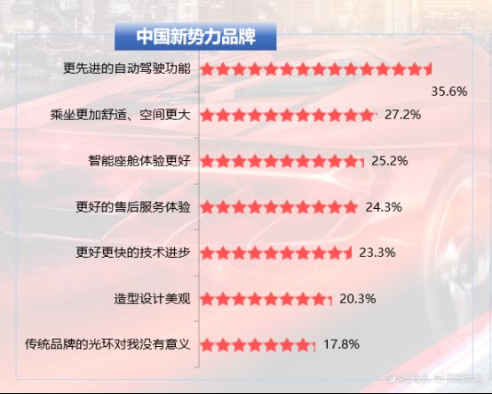 新能源汽车品牌中,中国新势力品牌势头正猛,在市场上的认可度越来越高。受访者选择中国新势力品牌,因其更加注重“更先进的自动驾驶功能”、“乘坐空间舒适、空间更大”以及“智能座舱体验感”。相比新势力品牌,受访者选择中国传统汽车品牌的原因主要包括“造车技术更有保障”、“整车品控成熟”。