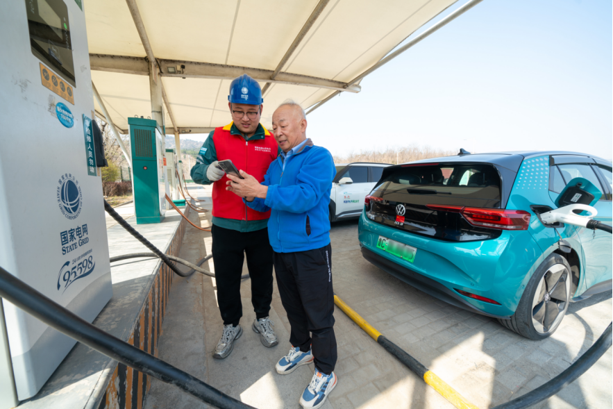 国网诸城市供电公司工作人员巡视检查超然台充电站充电设施,为到超然台景区旅游的新能源汽车车主提供可靠的充电服务。(钟健宁 摄)