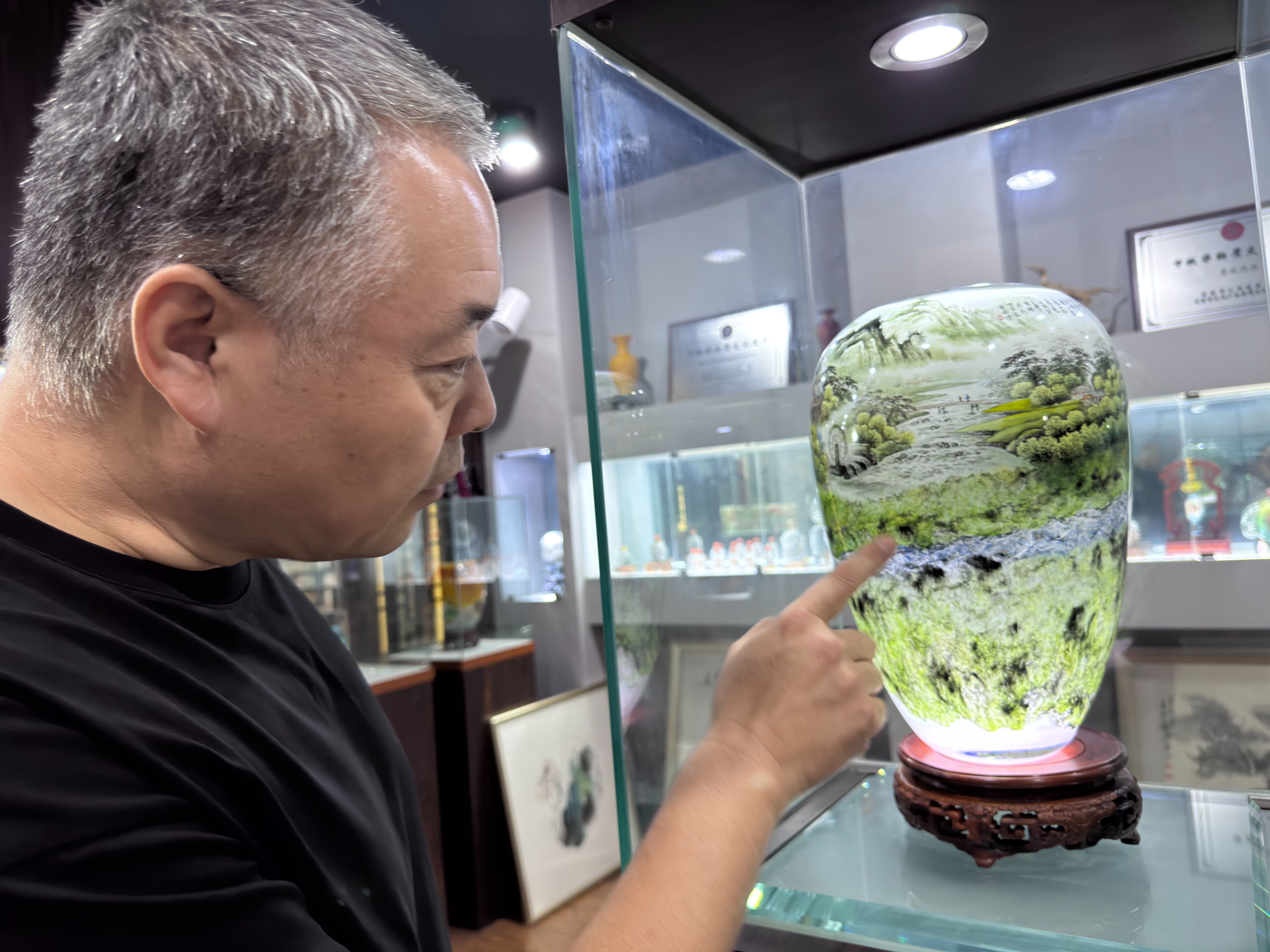如果说父亲的艺术重在“守”,张鹏身上则更多“破”的意味。他不仅继承了传统技巧,更在材质与题材上大胆创新,把琉璃烧制工艺与内画结合,首创“多彩琉璃内画瓶”。晶莹剔透的琉璃瓶身,与细腻精巧的画面相映成趣,传统技艺因此焕发出现代气息。