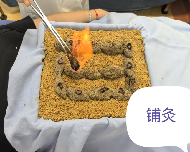 铺灸,又称“长蛇灸”“督脉灸”,与传统单穴艾灸不同,它是将大量艾绒铺在人体背部特定线路(通常为督脉)上进行大面积温灸。孙莉介绍,这种疗法使用大面积、大剂量的药物与艾灸结合,通过“姜 + 灸”产生 1 + 1>2 的效果,对产后子宫复旧不良、经络不通、寒湿侵袭等问题有积极作用。