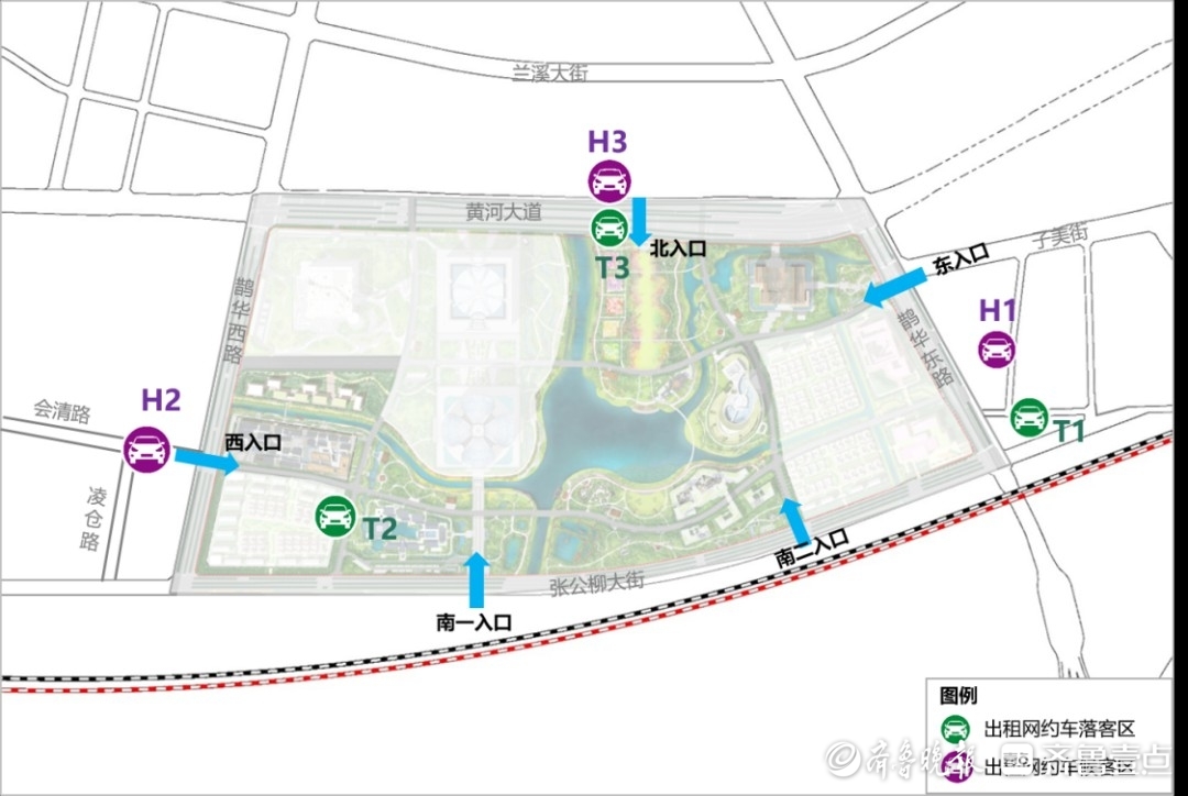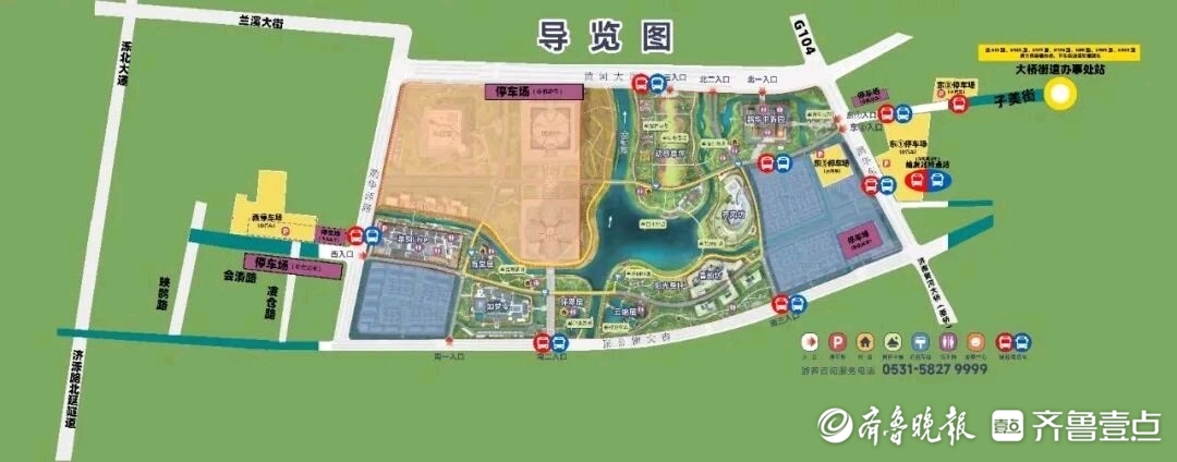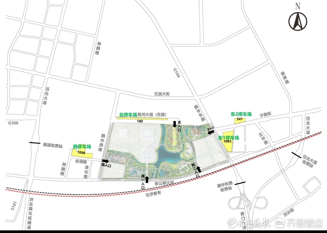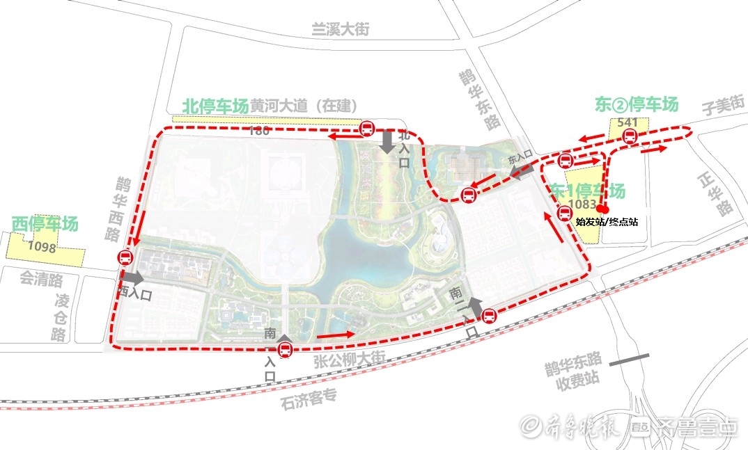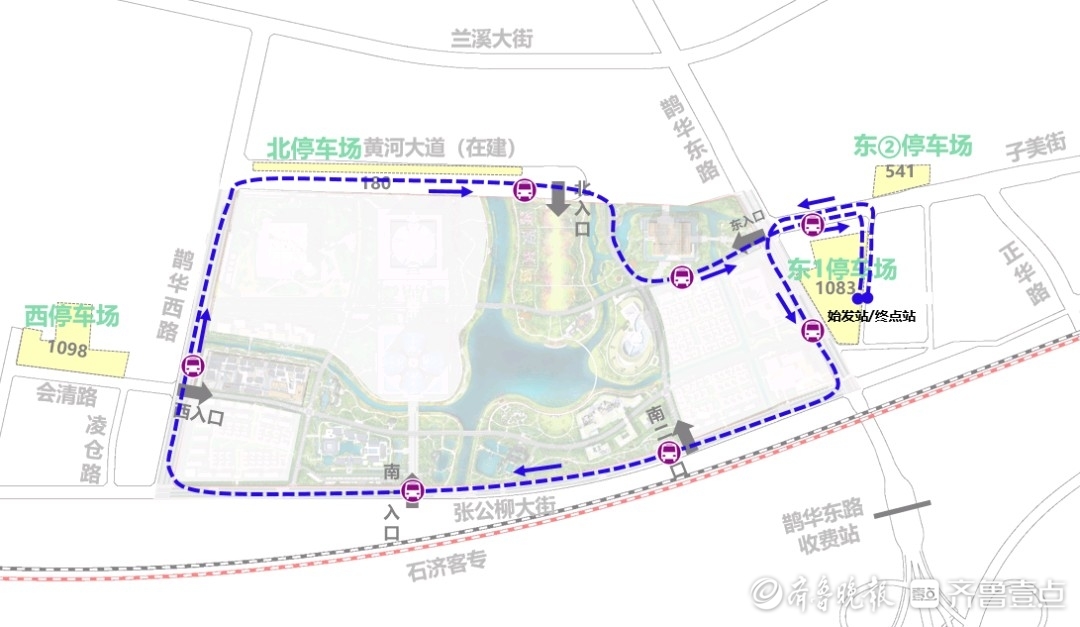 其中,黄河大桥方向车辆,建议走鹊华东路收费站-鹊华东路到东1停车场;或走岱北大道收费站-岱北大道-子美街到东2、东1停车场,停好后坐接驳车入园。