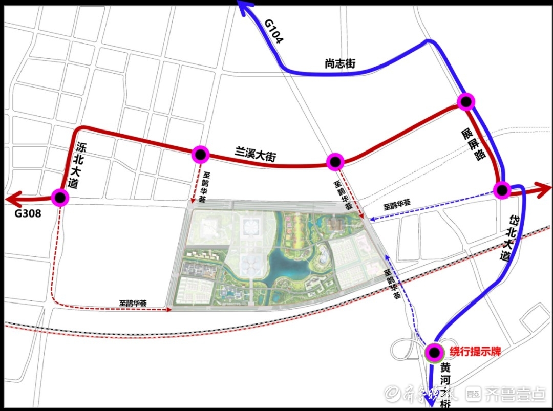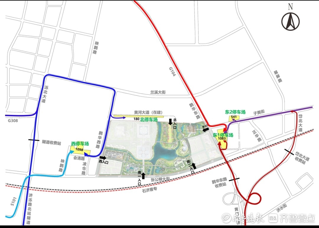 济南济泺路北延黄河隧道方向和G308方向,建议走泺北大道-兰溪大街-鹊华西路,到北停车场、西停车场。