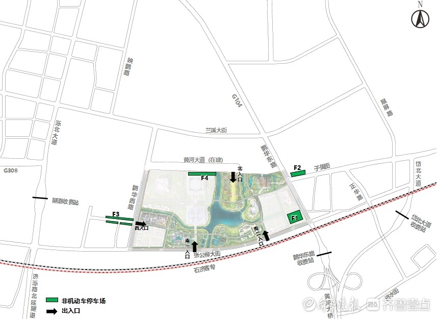 其中,经G104、鹊华东路、张公柳大街可前往园区东南侧的F1非机动车停车场,1158个泊位。