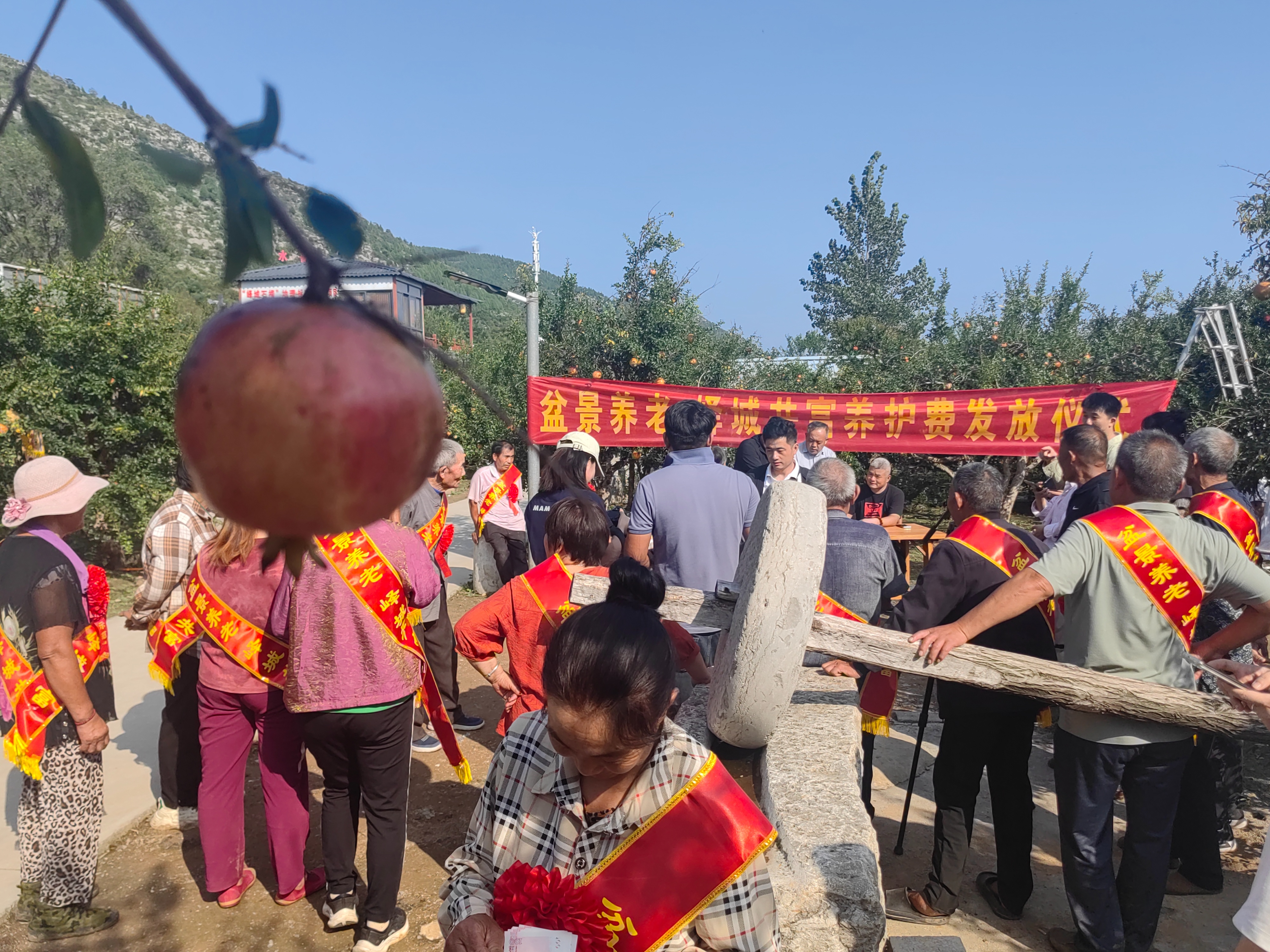挂在石榴树上的条幅格外醒目——“盆景养老·峄城共富养护费发放仪式”,村里的老人们在一旁翘首以待。
