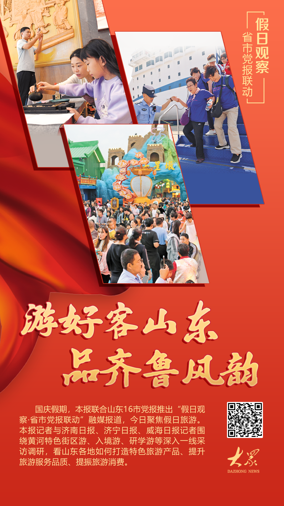 国庆假期,本报联合山东16市党报推出“假日观察·省市党报联动”融媒报道,今日聚焦假日旅游。本报记者与济南日报、威海日报、济宁日报记者围绕黄河特色街区游、入境游、研学游等深入一线采访调研,看山东各地如何打造特色旅游产品、提升旅游服务品质、提振旅游消费。
